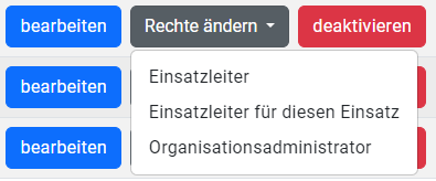 Im User-Listing sehen Sie alle User ihrer Organisation mit den wichtigsten Informationen zur Funktion des Users. Es werden alle User aufgelistet, sowohl aktive User die an Einsätzen und Übungen teilnehmen können, wie auch deaktivierte User (rot hinterlegt) die nur noch in der Dokumentation vorkommen.