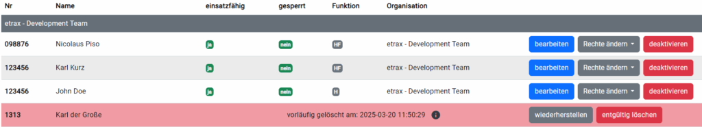 der User kann in keinem Einsatz mehr verwendet werden, in der Dokumentation von Einsätzen bleibt der User bestehen. Der Sinn dahinter ist, dass der User in den abgespeicherten Dokumentationen erhalten bleibt, auch wenn der User nicht mehr eingesetzt werden kann.